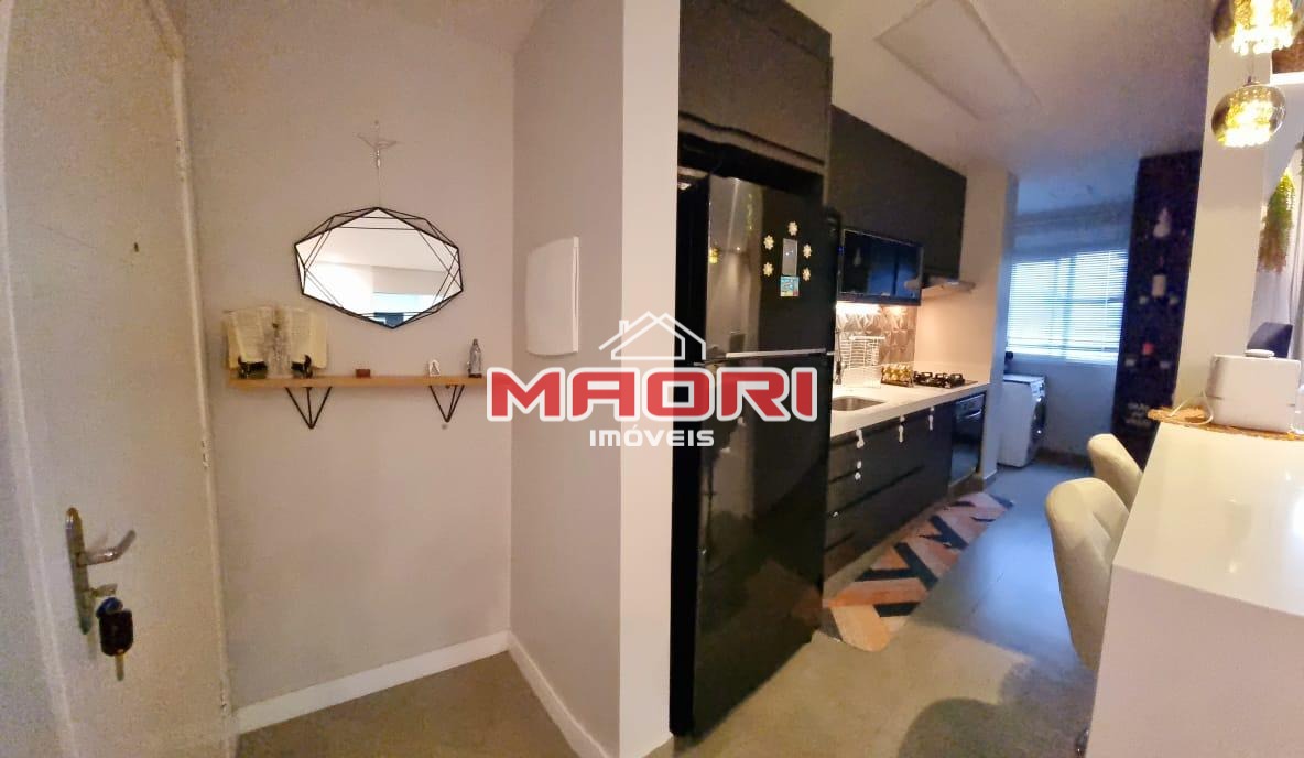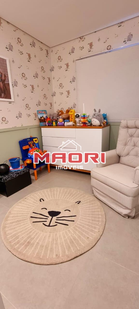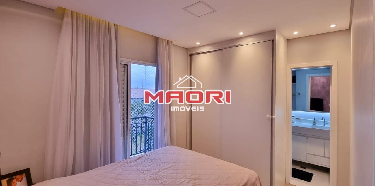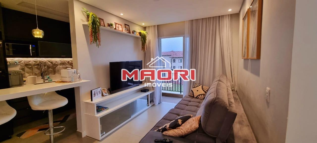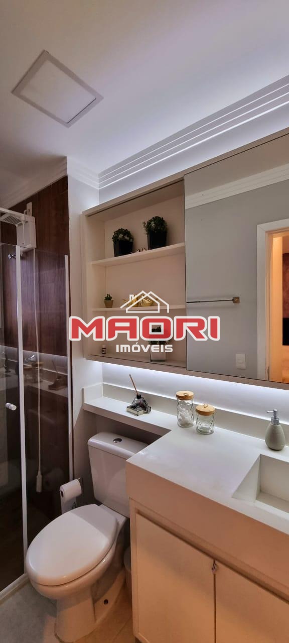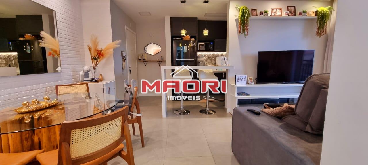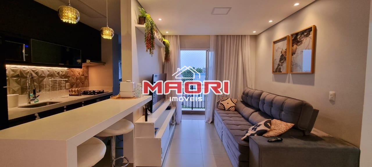 Possui 2 quartos com armários planejados, sendo 1 suíte com varanda, banheiro social, sala de estar com painel de TV, sala de jantar, varanda/sacada, cozinha americana planejada, lavanderia e 1 vaga de garagem coberta.