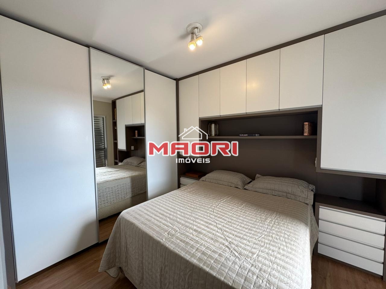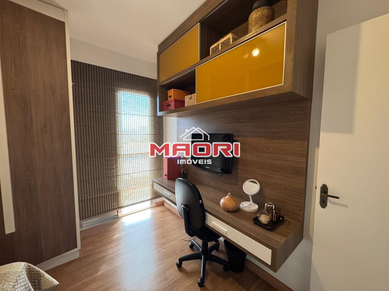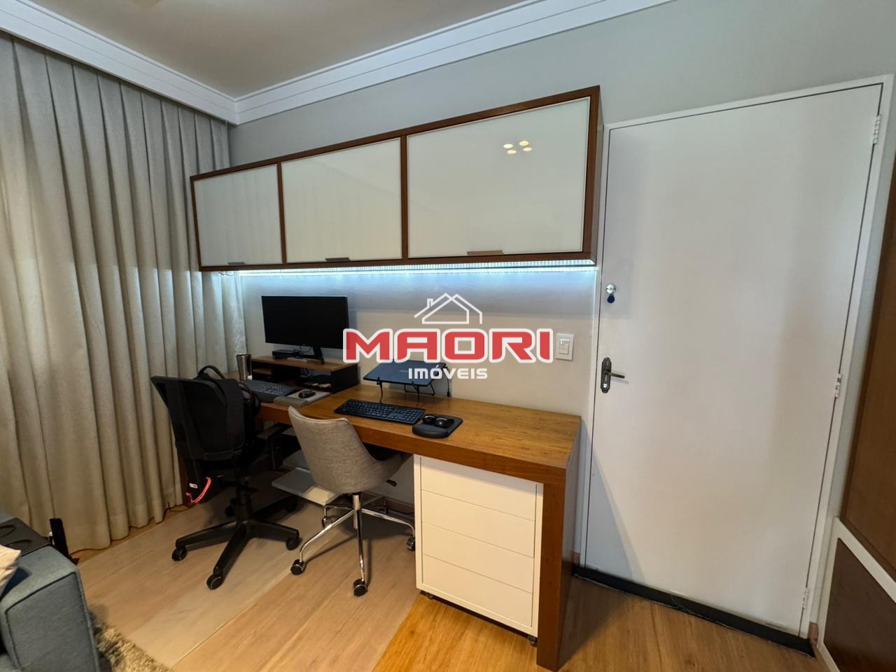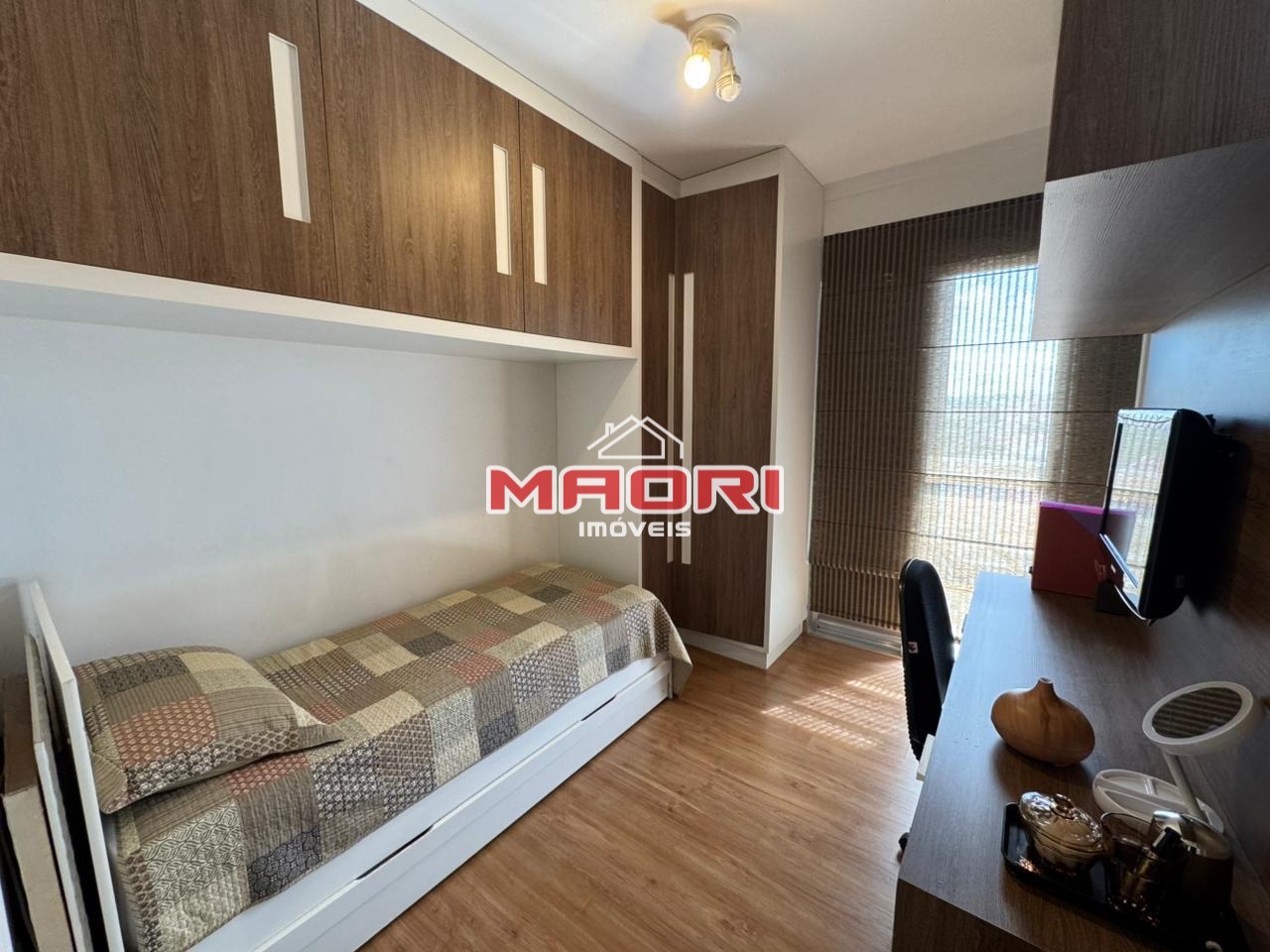 Possui 3 quartos com armários planejados, sendo 1 suíte com sacada, banheiro social, sala de estar com painel de TV e espaço para escritório, sala de jantar, cozinha com armários planejados, lavanderia e 2 vagas de garagem descobertas.