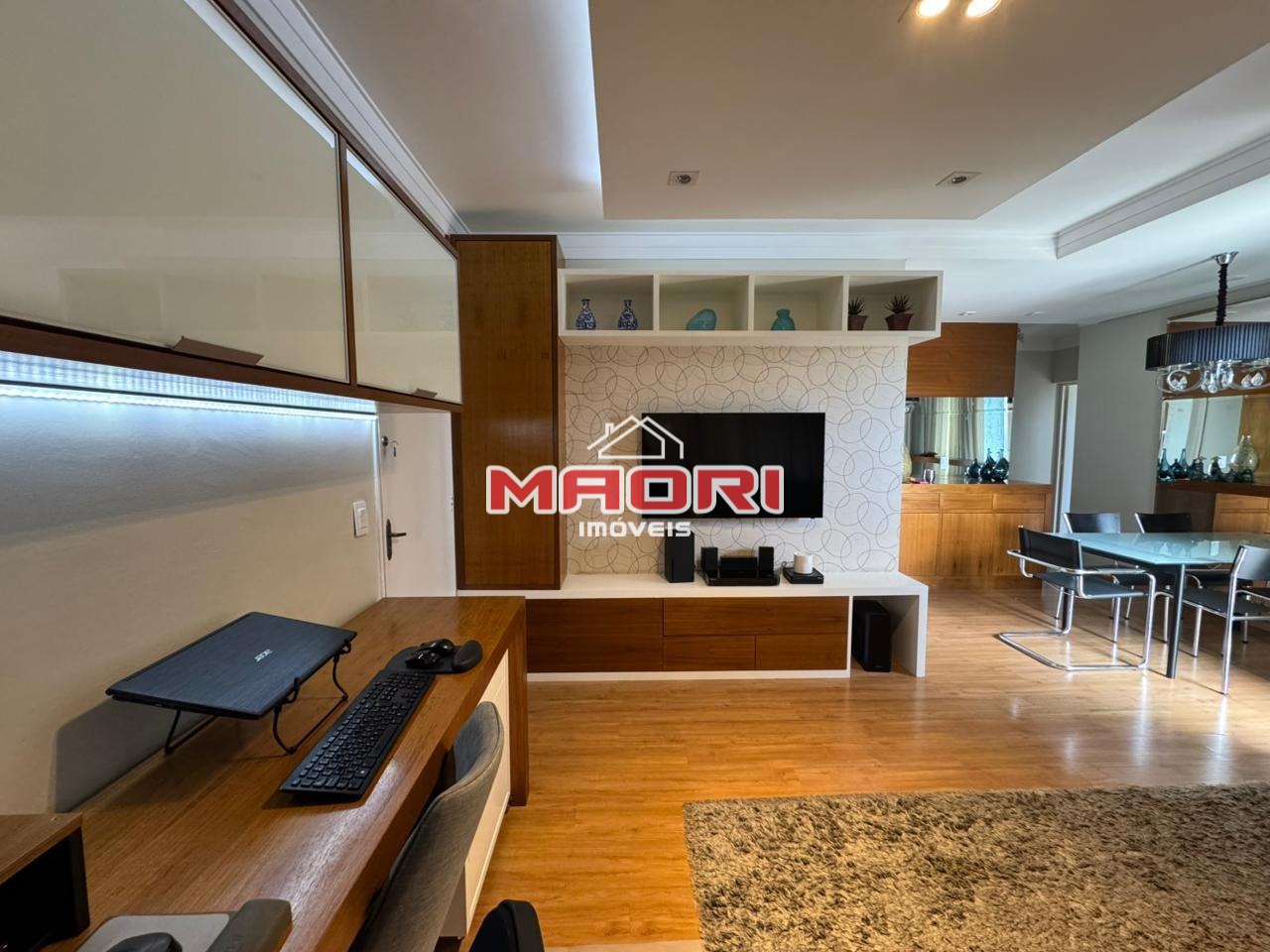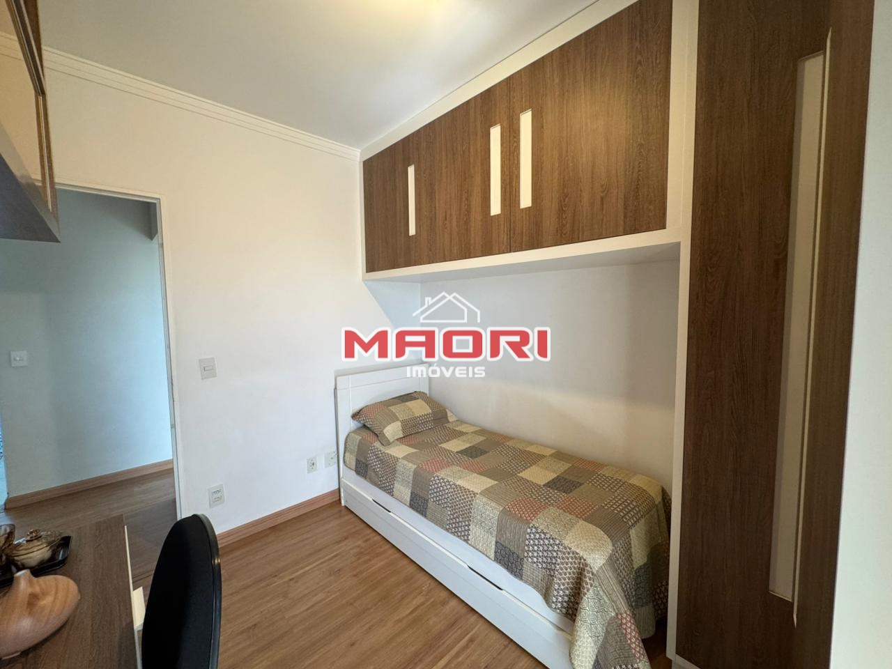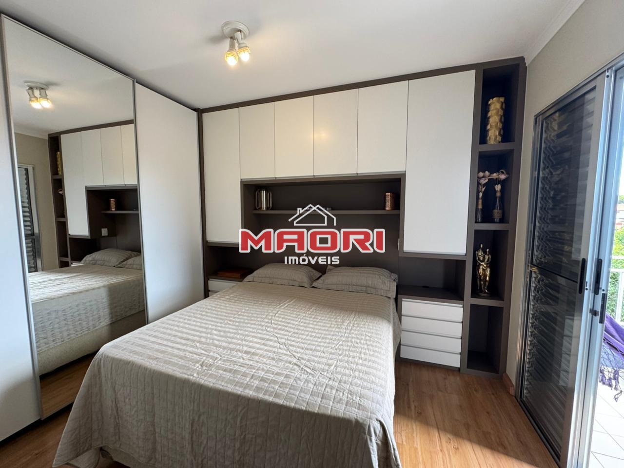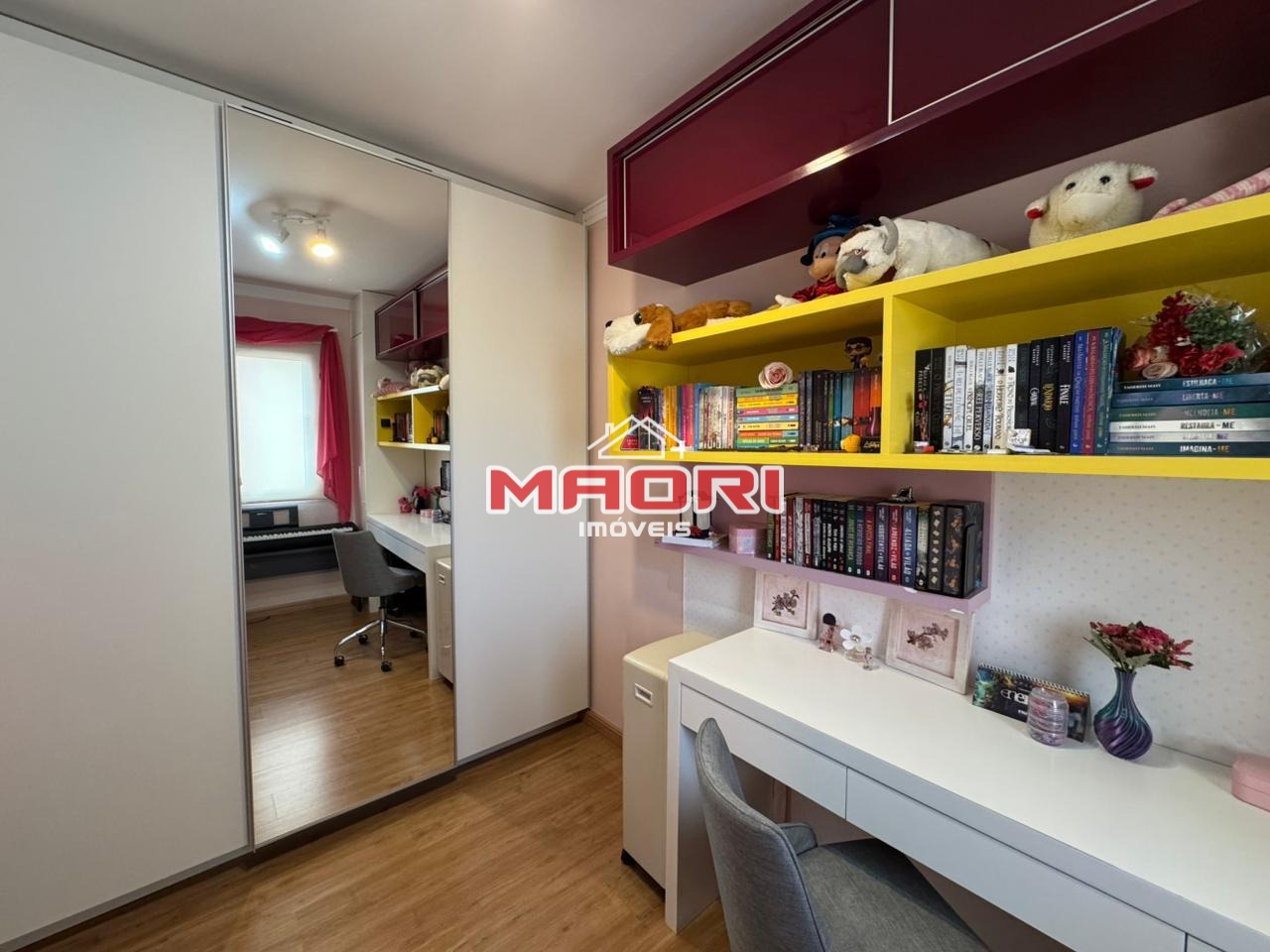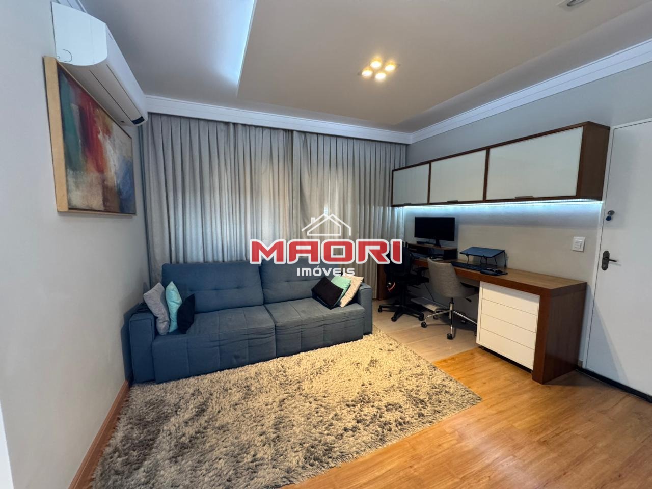 Possui 3 quartos com armários planejados, sendo 1 suíte com sacada, banheiro social, sala de estar com painel de TV e espaço para escritório, sala de jantar, cozinha com armários planejados, lavanderia e 2 vagas de garagem descobertas.