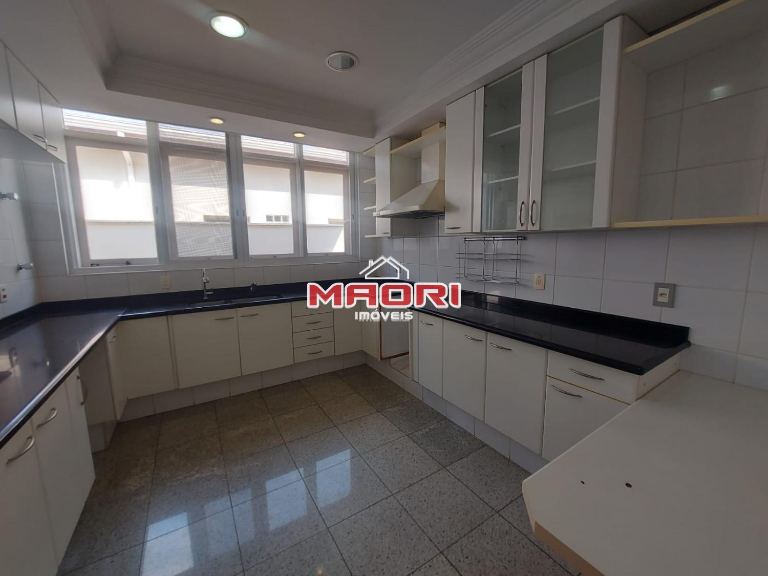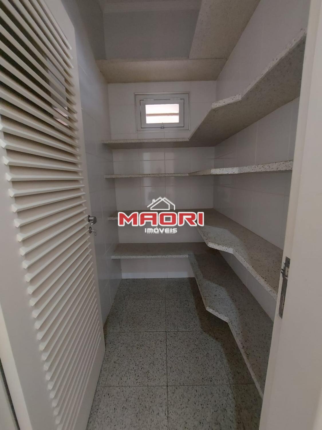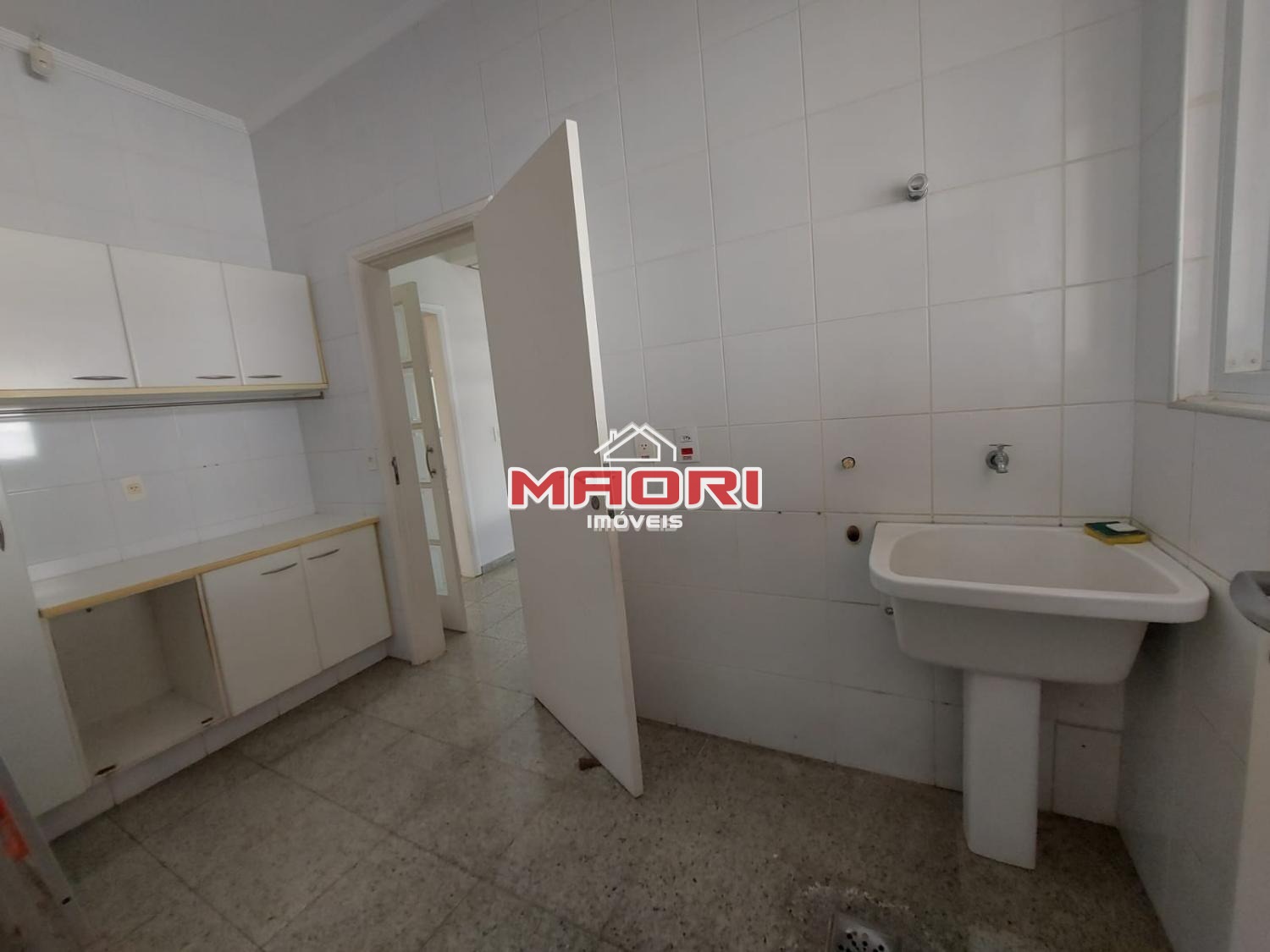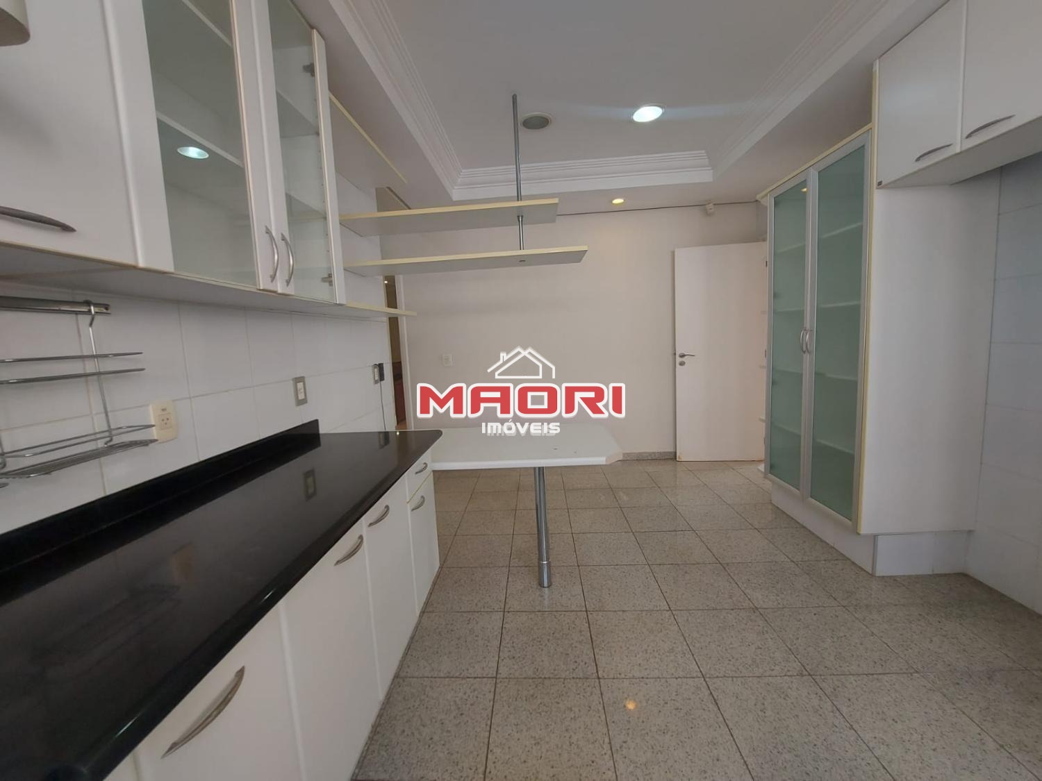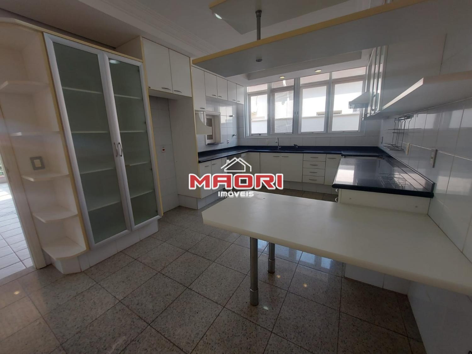 Cozinha ampla com armários, despensa, lavanderia, quarto de empregada com banheiro.