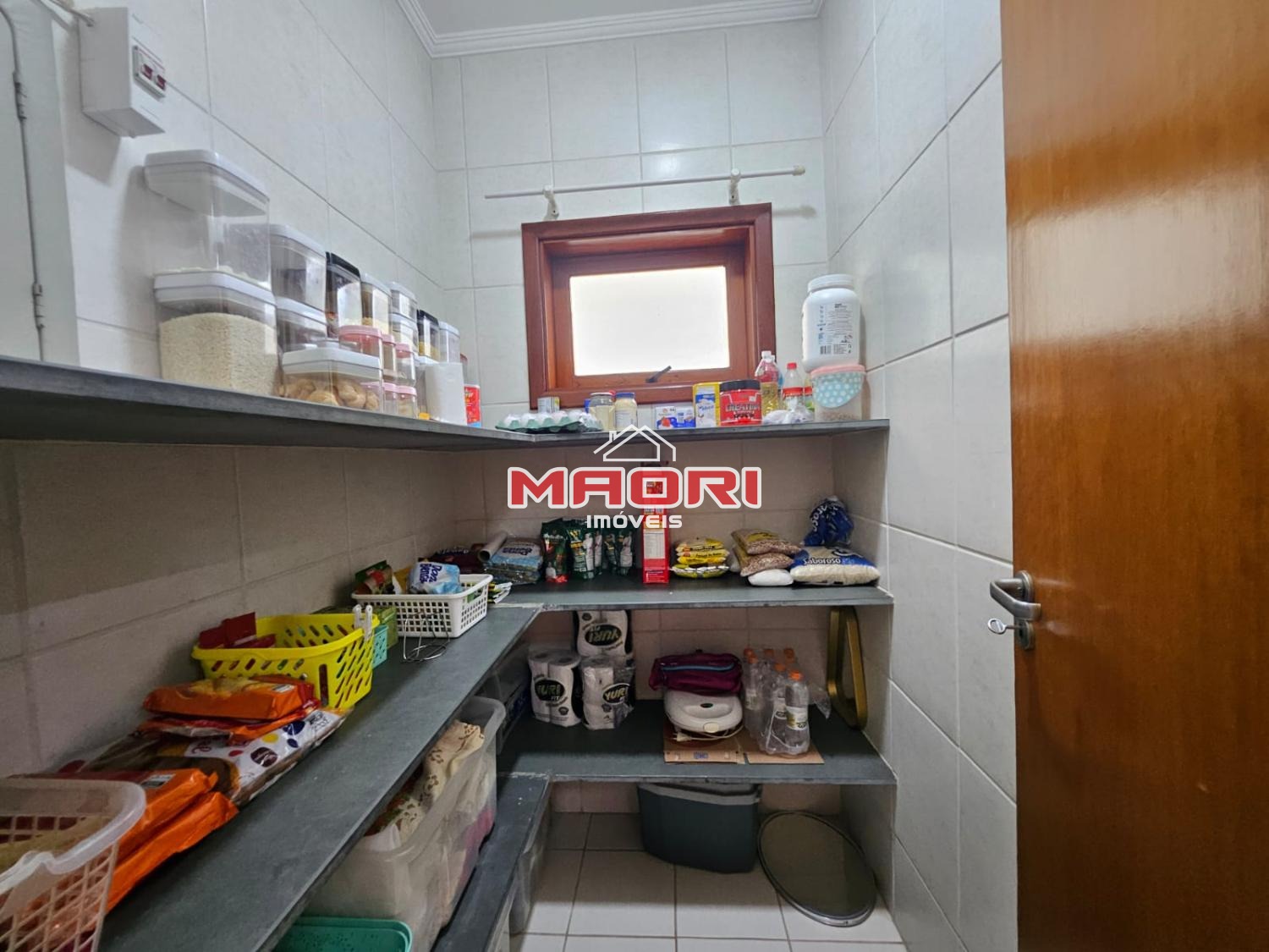 Cozinha com armários planejados e despensa.
