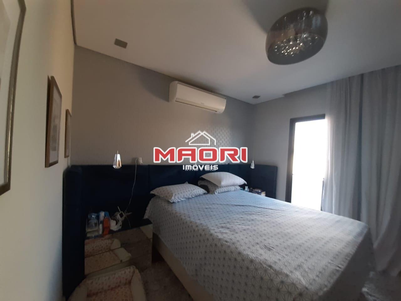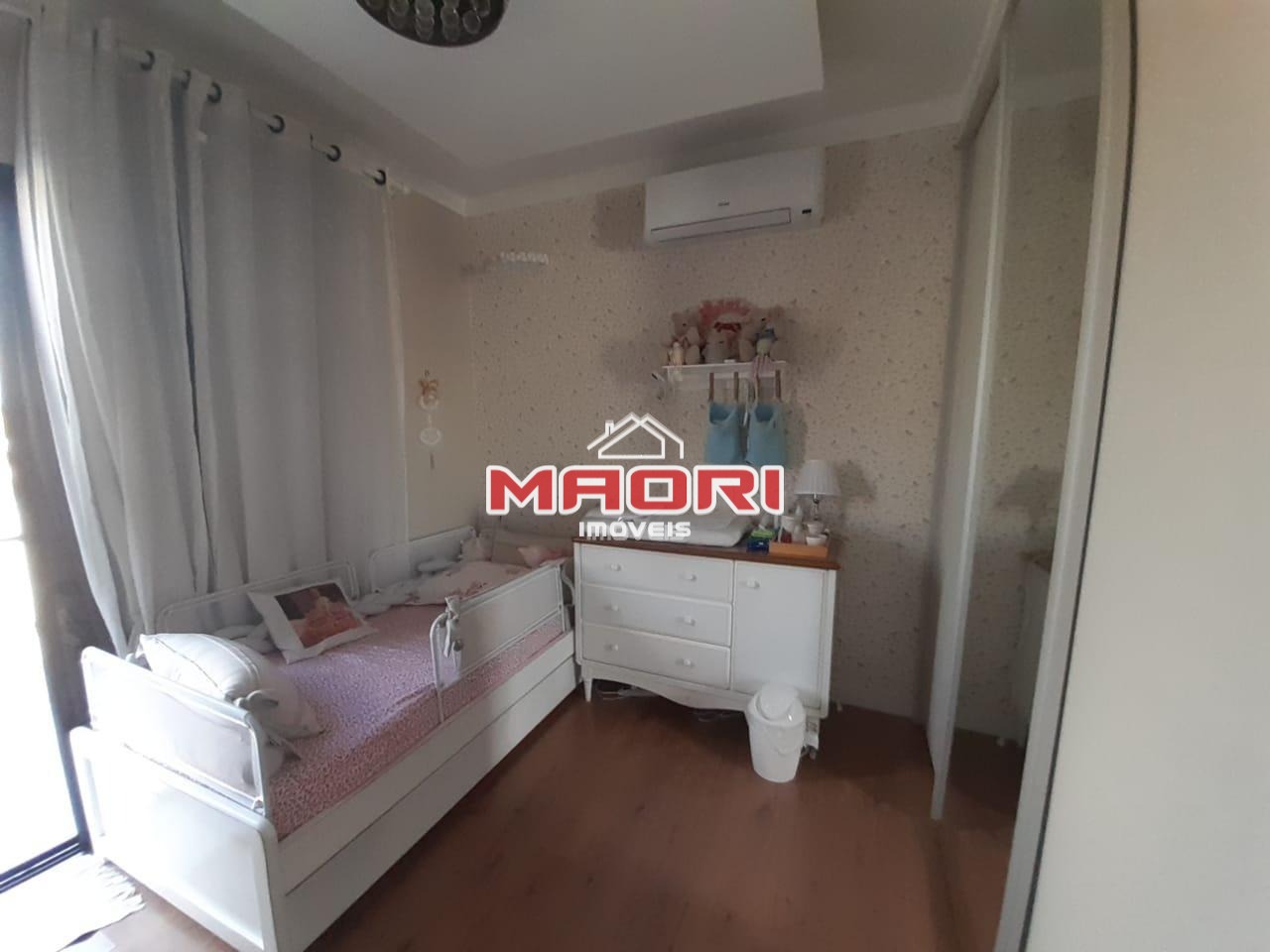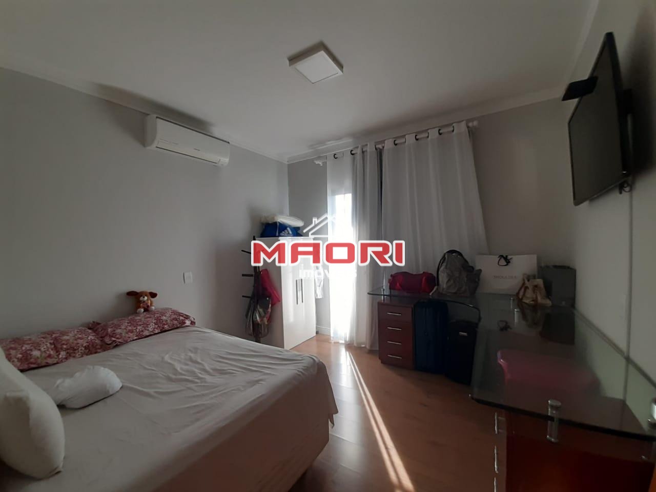 Sobrado com 3 quartos sendo 1 suíte com closet, todos com ar condicionado, roupeiro no corredor.