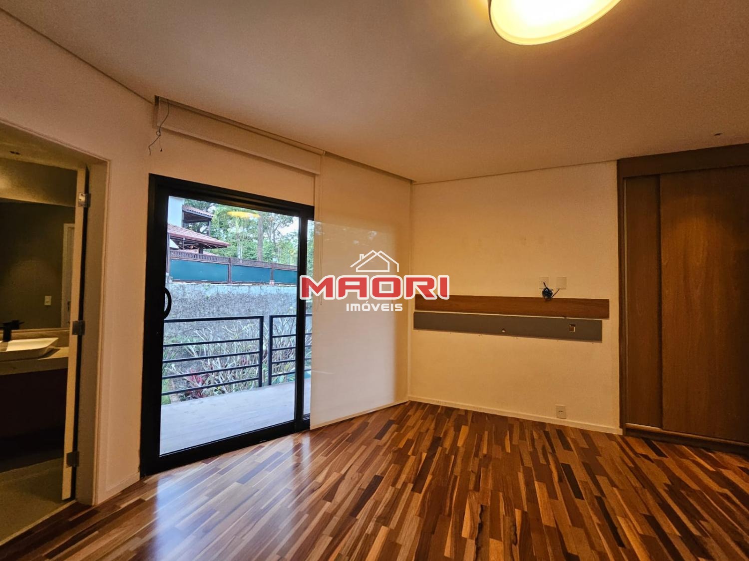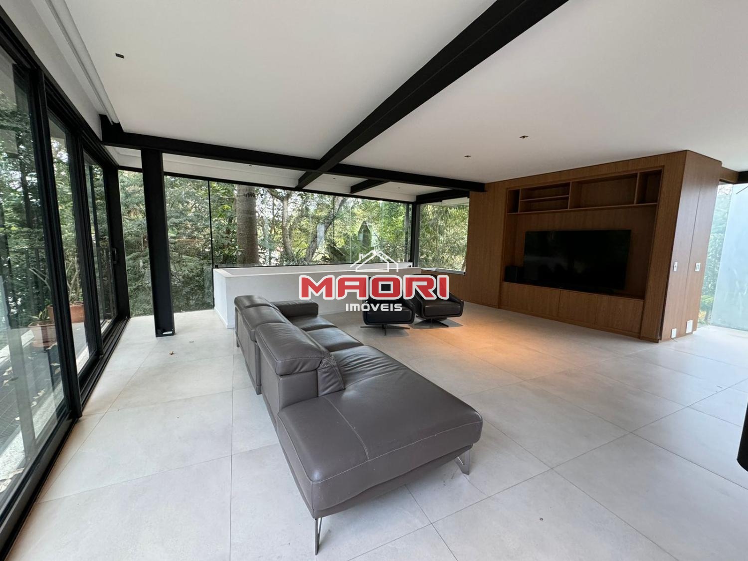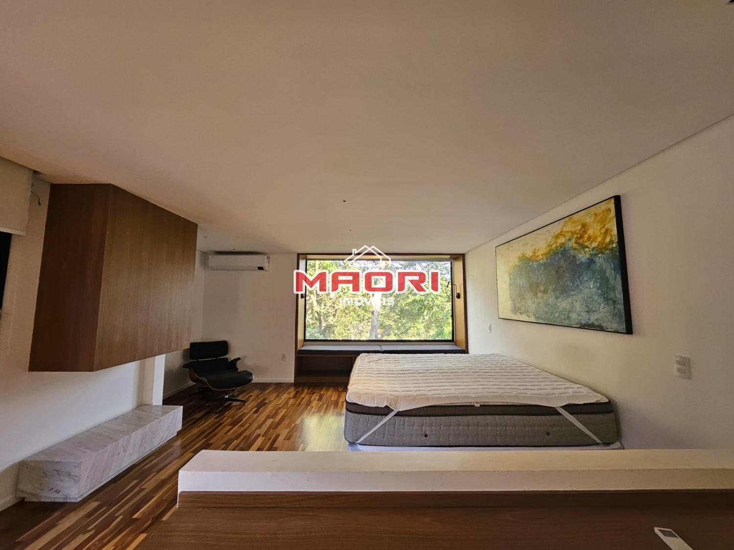 Possui 3 suítes com armários embutidos, sendo 2 suítes com closet e a suíte do casal com cortina automatizada, sala de estar, sala de jantar ampla, cozinha americana com armários embutidos, lavanderia, lavabo, belíssimo quintal rodeado por muita área verde, piscina, sala de TV com fechamento em vidro, vista para mata e com banheiro social.