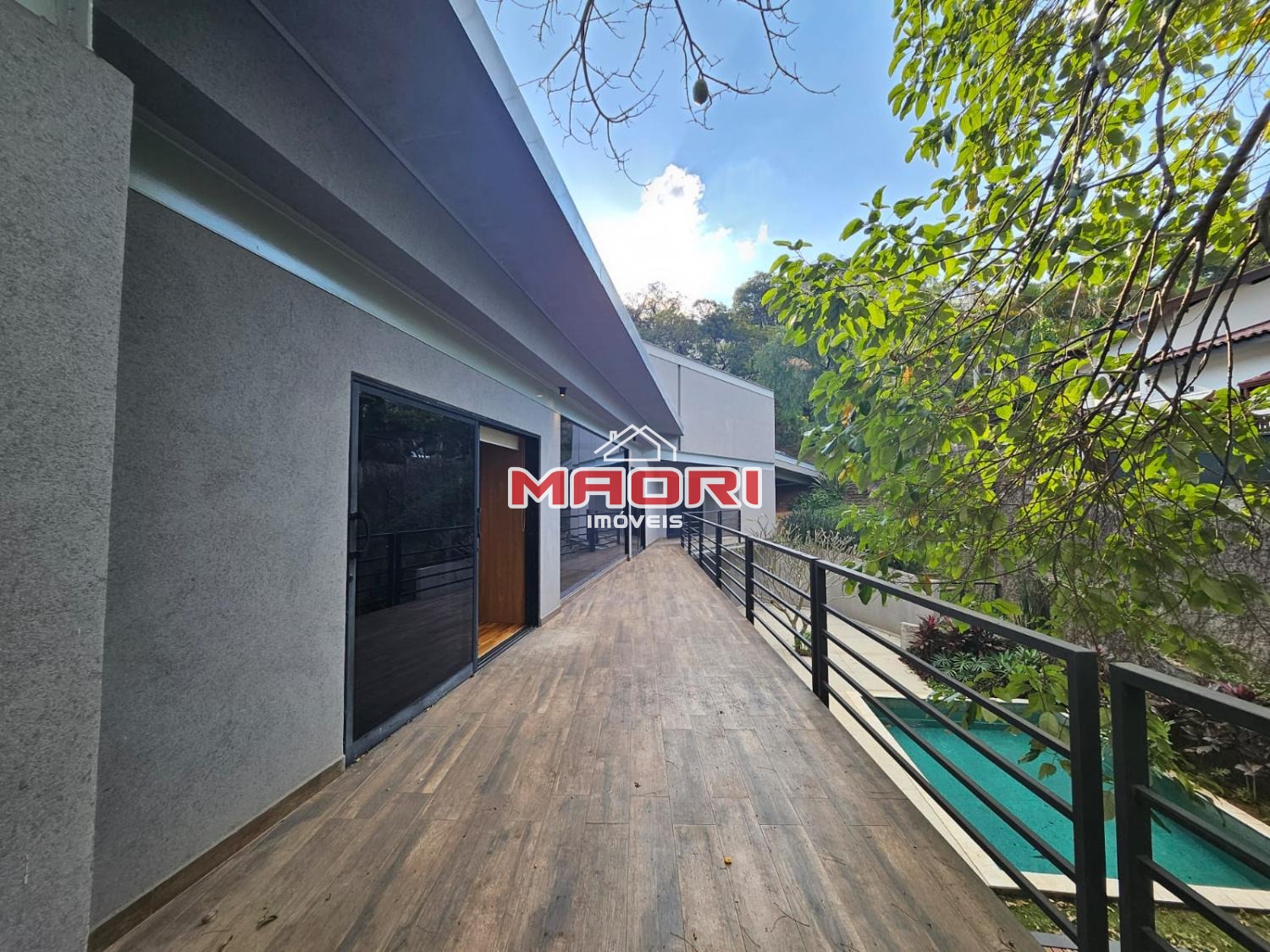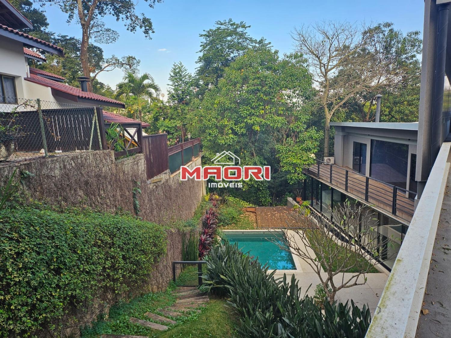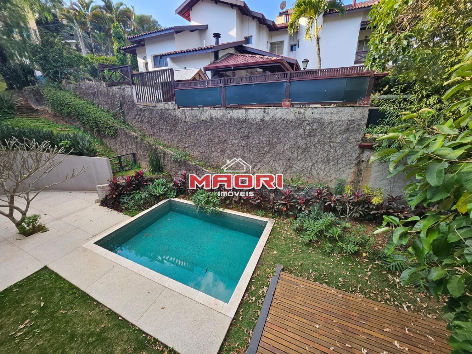 Possui 3 suítes com armários embutidos, sendo 2 suítes com closet e a suíte do casal com cortina automatizada, sala de estar, sala de jantar ampla, cozinha americana com armários embutidos, lavanderia, lavabo, belíssimo quintal rodeado por muita área verde, piscina, sala de TV com fechamento em vidro, vista para mata e com banheiro social.