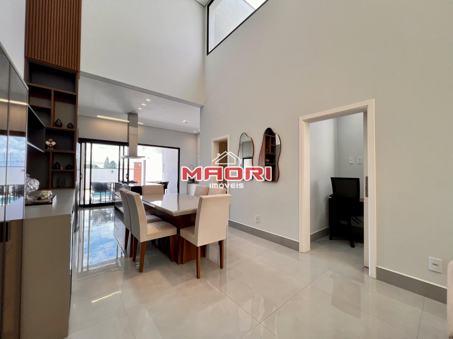 Possui 3 suítes, sendo 1 com espaço para closet, sala de estar e jantar com pé direito alto, escritório, lavabo, cozinha americana, espaço gourmet com churrasqueira, quintal, piscina, banheiro externo, lavanderia e 4 vagas de garagem sendo 2 cobertas.