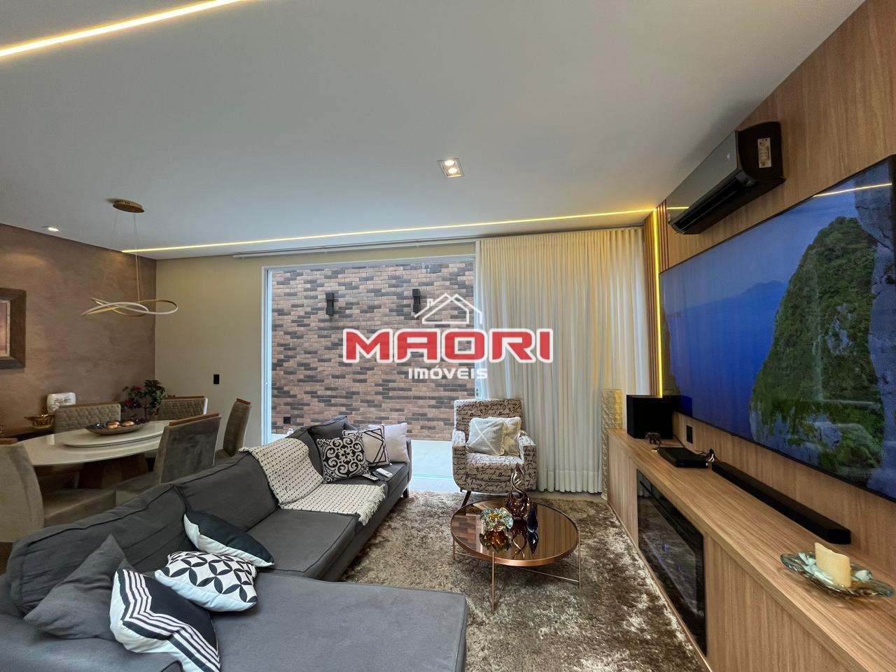 Possui 3 suítes, sendo 1 suíte com closet, sala íntima na parte de cima, escritório, lavabo, sala de estar com painel de TV, sala de jantar, cozinha americana com armários planejados, churrasqueira integrada à cozinha, lavanderia com armários, quintal e 2 vagas de garagem descobertas.