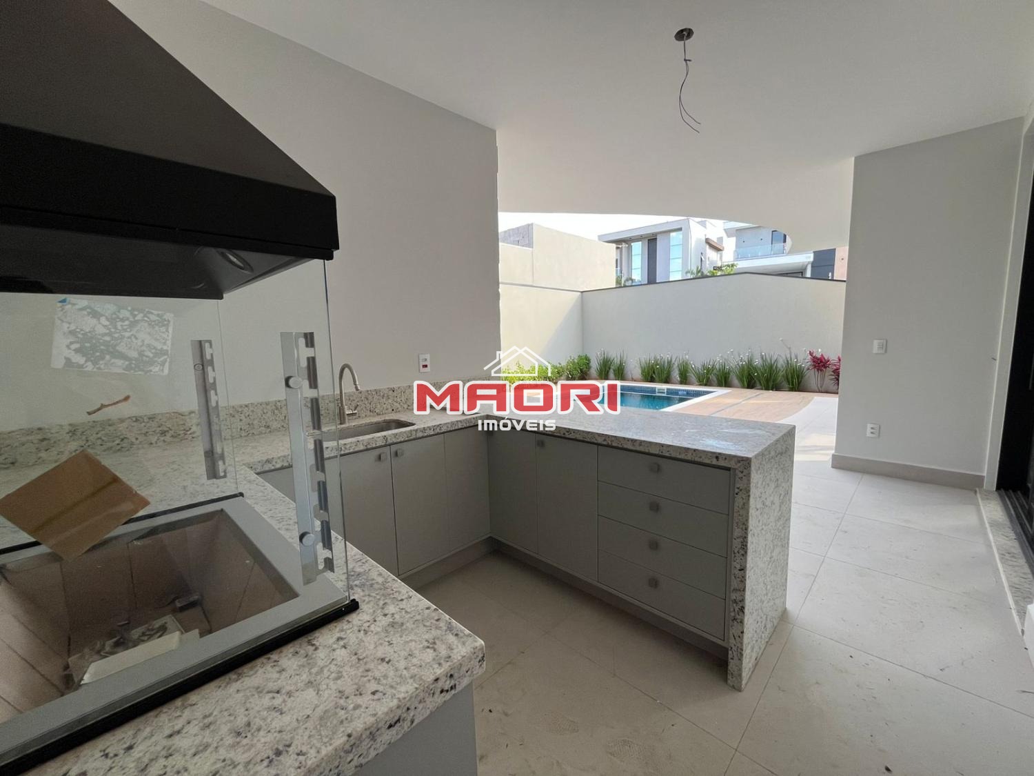 Espaço gourmet com churrasqueira, quintal, piscina e banheiro externo.