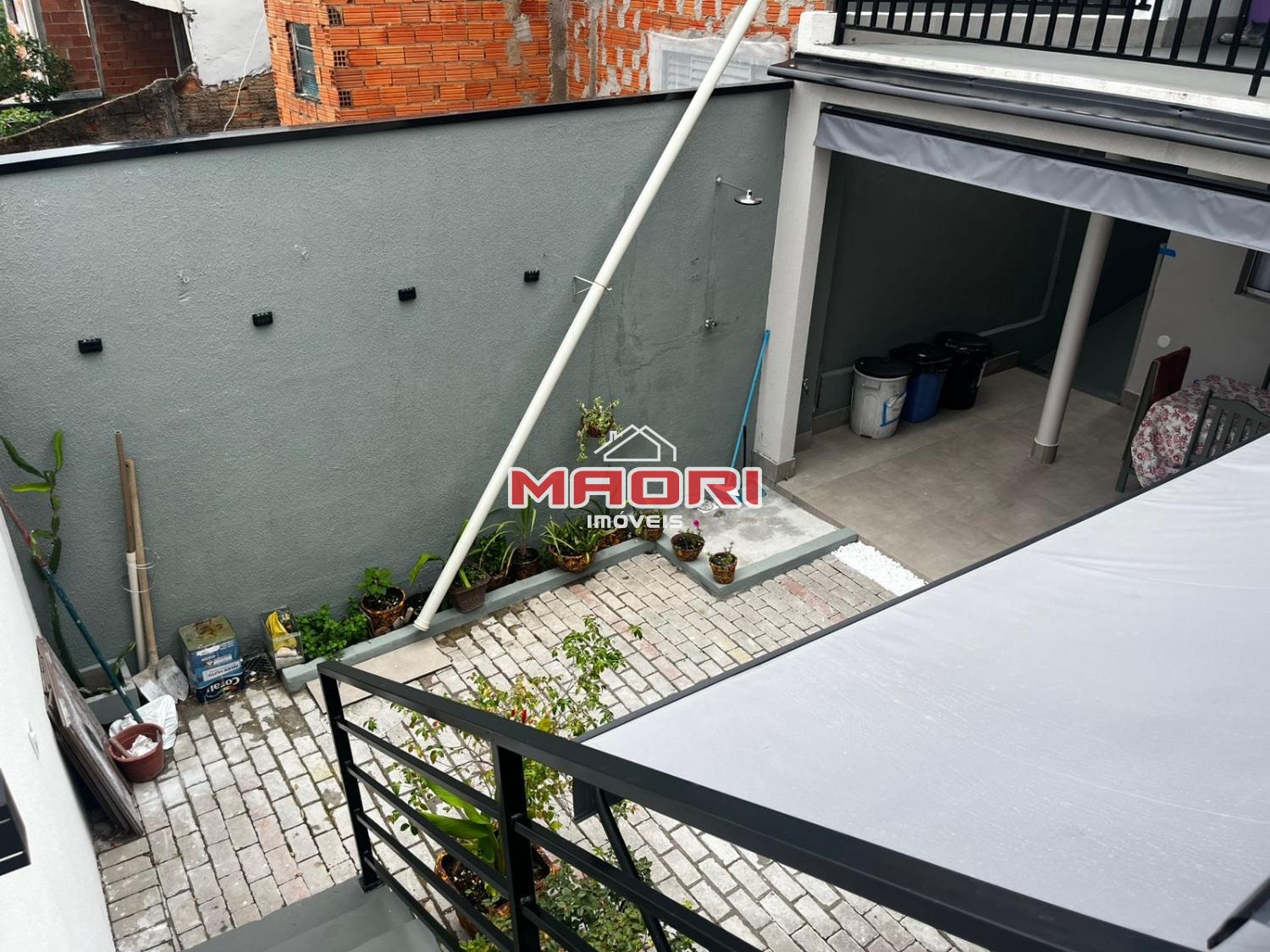 Sobrado em um terreno de declive, com 3 quartos no nível da rua, sendo 1 suíte com armário planejado, além de banheiro social e sala de estar.