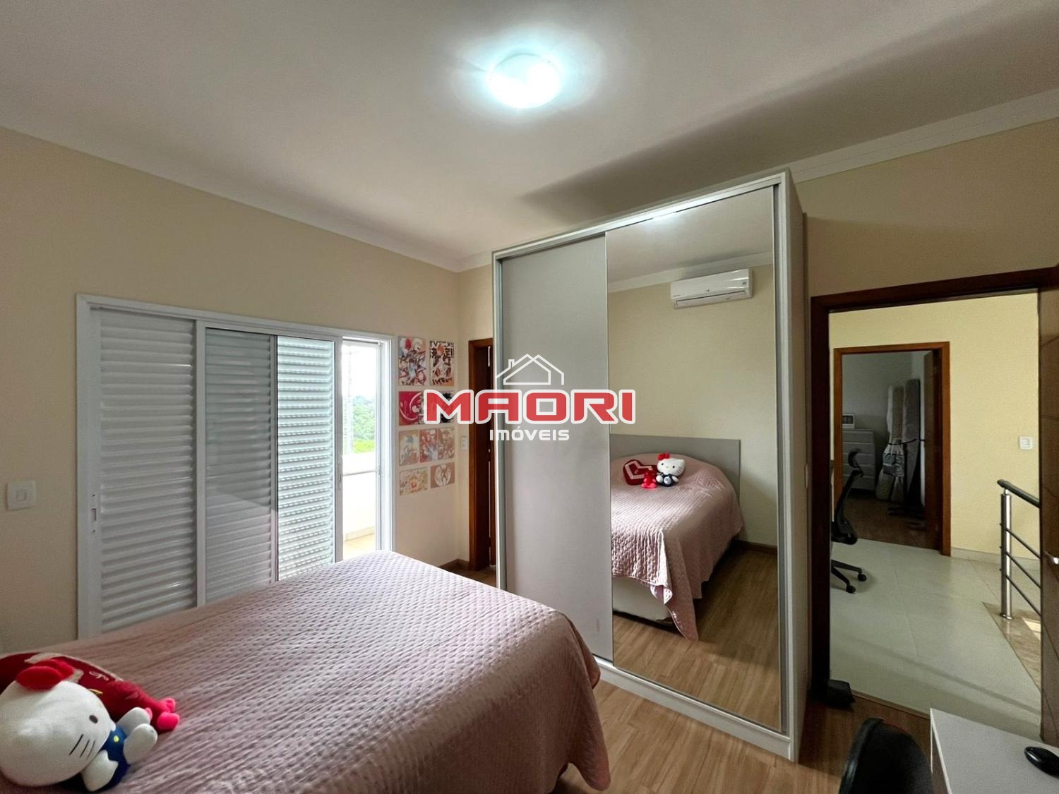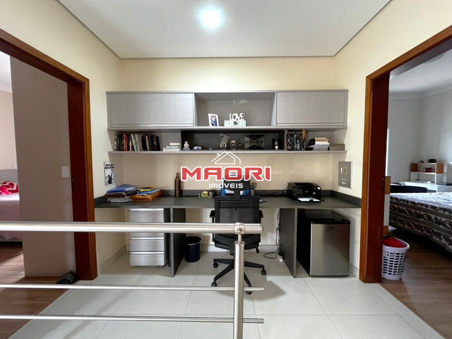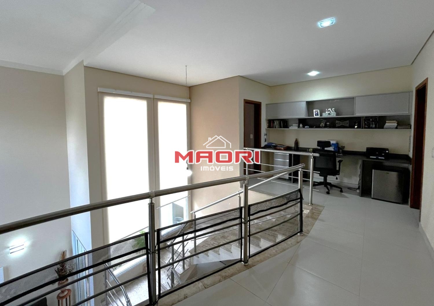 No andar superior, temos 3 quartos, sendo 3 suítes com armários planejados e ar condicionado, sendo 1 suíte com espaço para closet e escritório aberto com armário planejado.