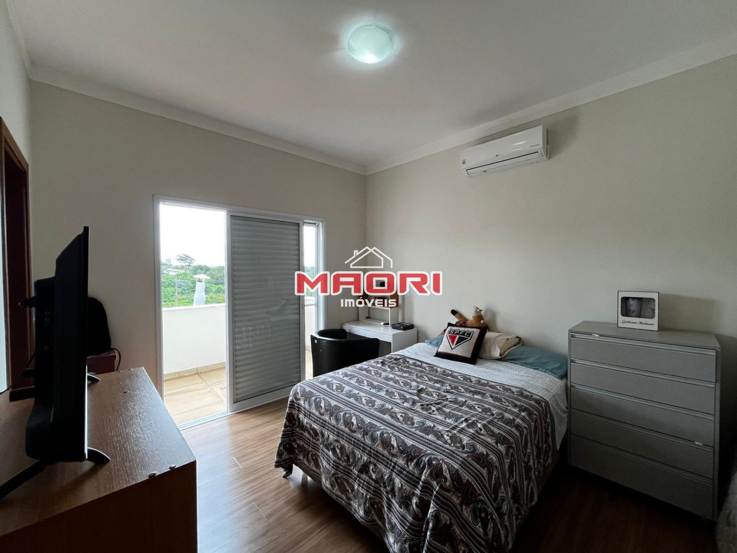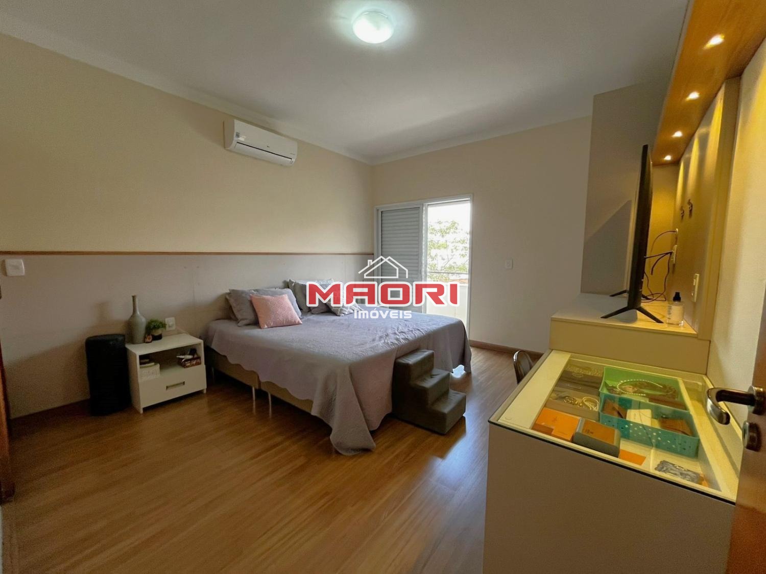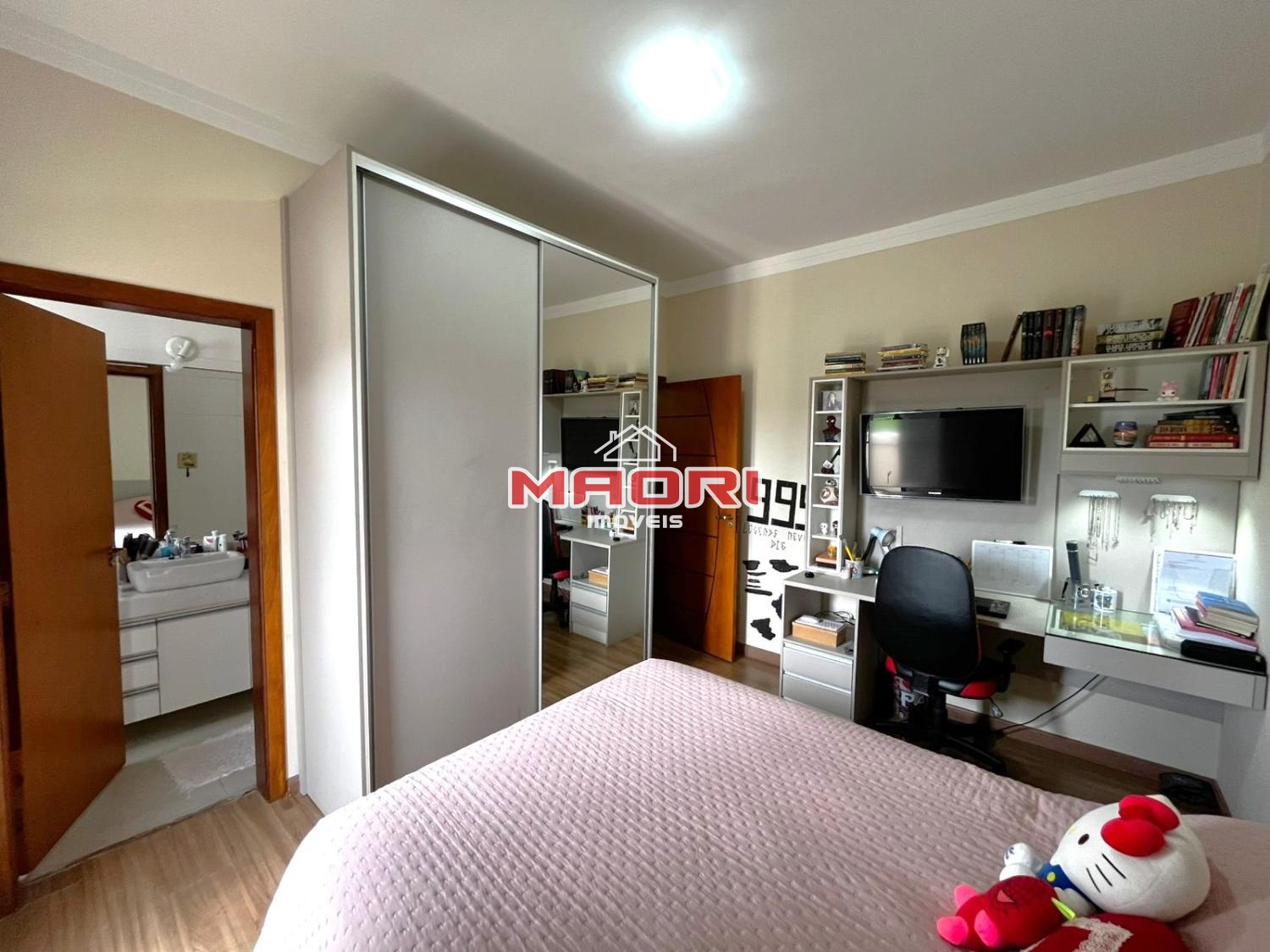 No andar superior, temos 3 quartos, sendo 3 suítes com armários planejados e ar condicionado, sendo 1 suíte com espaço para closet e escritório aberto com armário planejado.
