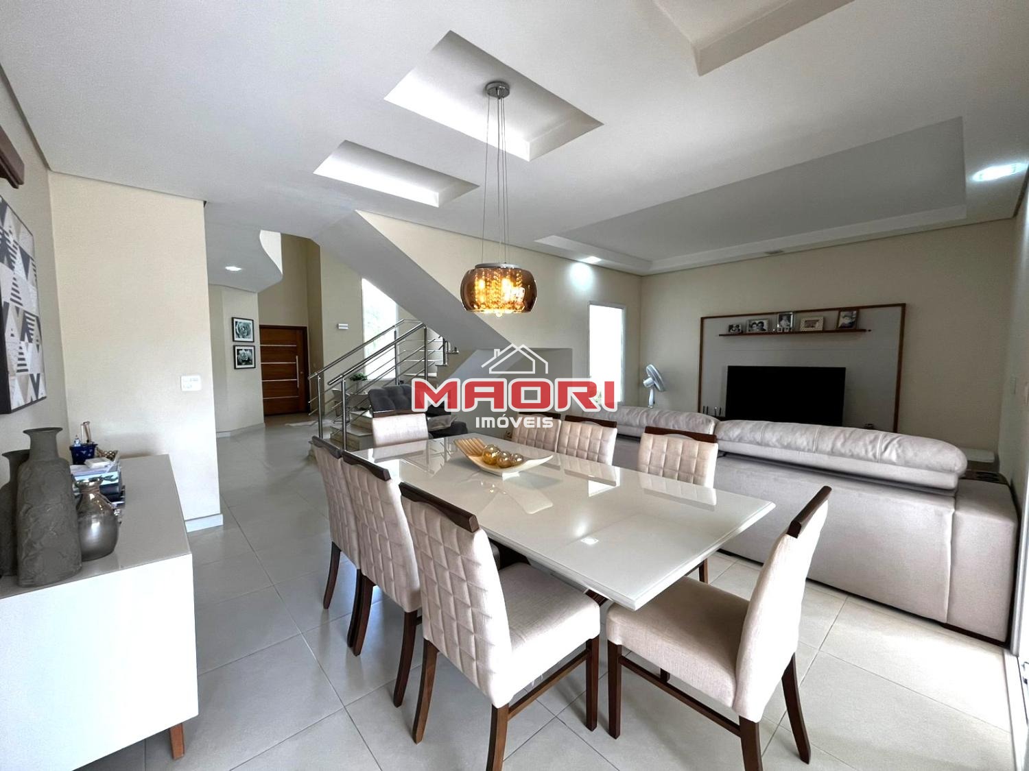 No andar térreo temos sala de estar com pé direito duplo, lavabo, jardim de inverno, sala de TV integrada à sala de jantar, cozinha fechada com armários planejados, despensa e lavanderia.