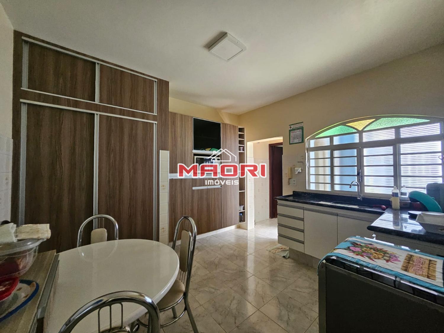 Sala de TV, sala de jantar, linda cozinha com armários planejados e lavanderia.