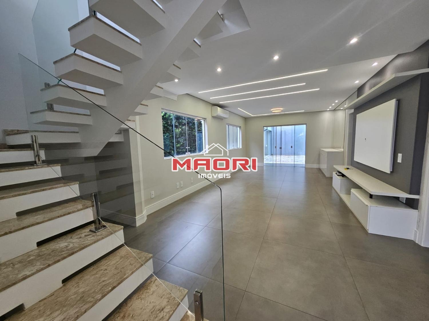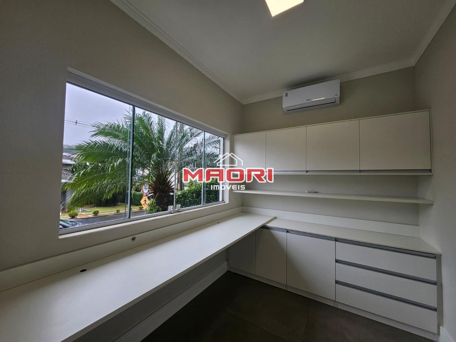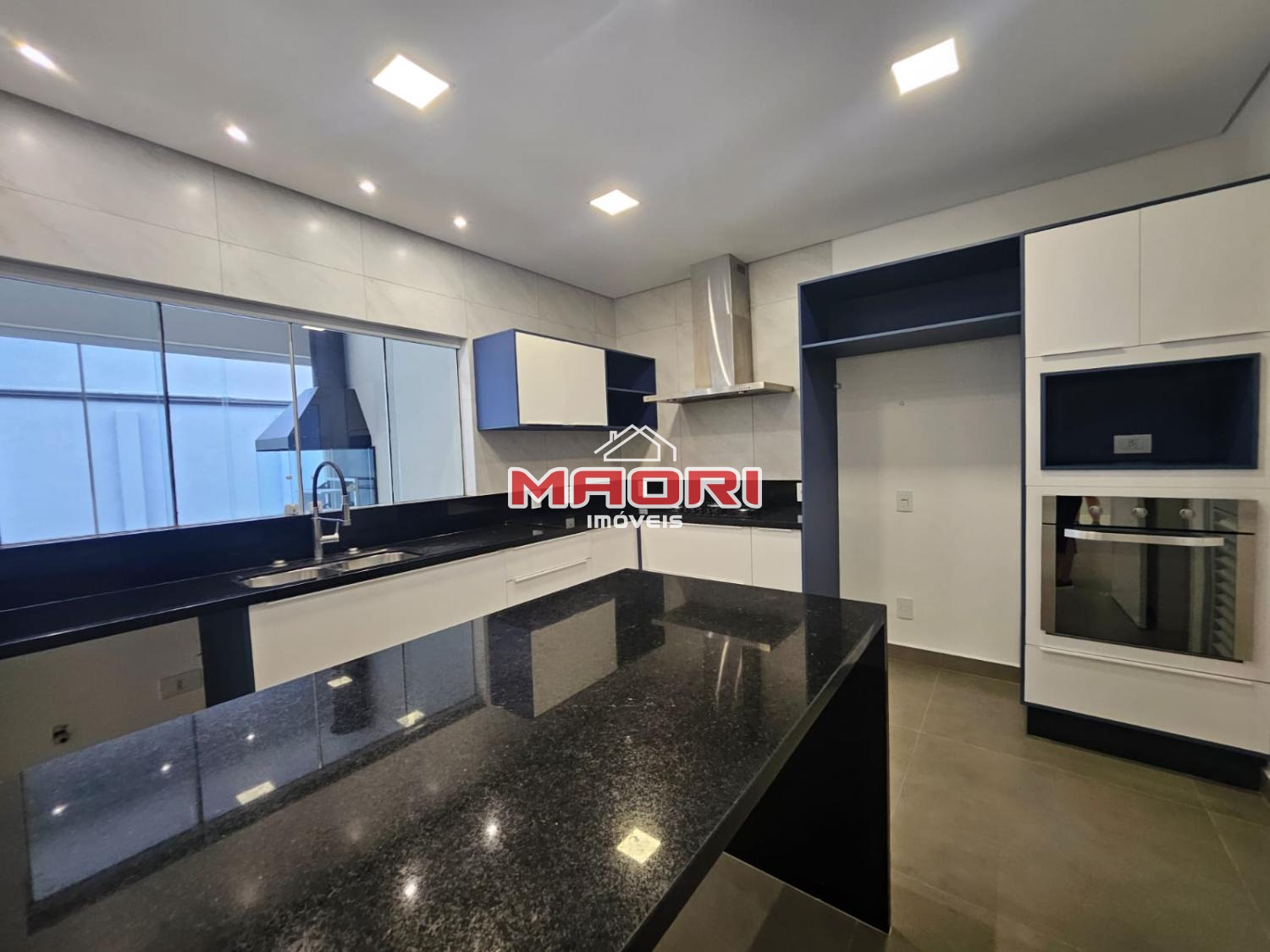 Escritório, lavabo, salas amplas com painel de TV, cozinha planejada com cooktop e coifa, despensa ampla e lavanderia.