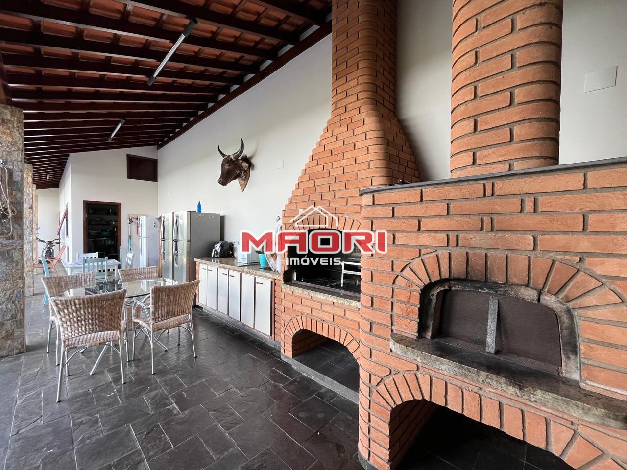 Área externa com lavanderia, espaço gourmet com churrasqueira, forno de pizza, fogão à lenha, piscina, banheiro feminino e masculino, sauna, despensa, 5 vagas de garagem.